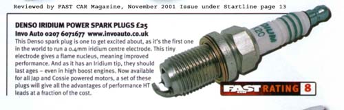 "Denso Iridium Power Spark Plugs by FAST CAR This Denso spark plug is one to get excited about, as its the first one in the world to run a 0.4mm iridium centre electrode. This tiny electrode gives a flame nucleus, meaning improved performance. And as it has an iridium tip, they should last ages - even in high boost engines. Now available for all Jap and Cossie powered motors, a set of these plugs will give all the advantages of performance HT leads at a fraction of the cost." |