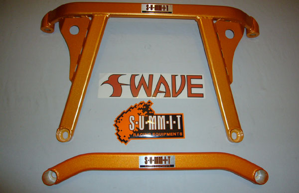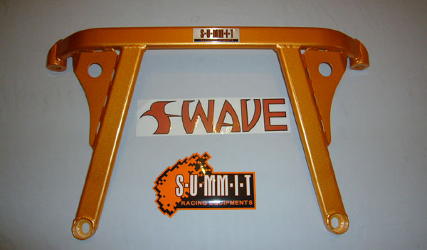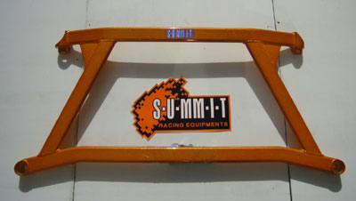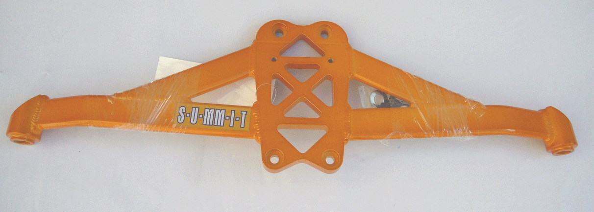 These front lower bars from SUMMIT and SWAVE strengthens the front control arms by bracing the sheet metal at its weakest point. Designed specially for hard core performance drivers. Suspension stability and handling is improved by eliminating the flexing, common in lower mounted front control arms. |