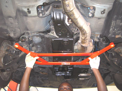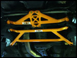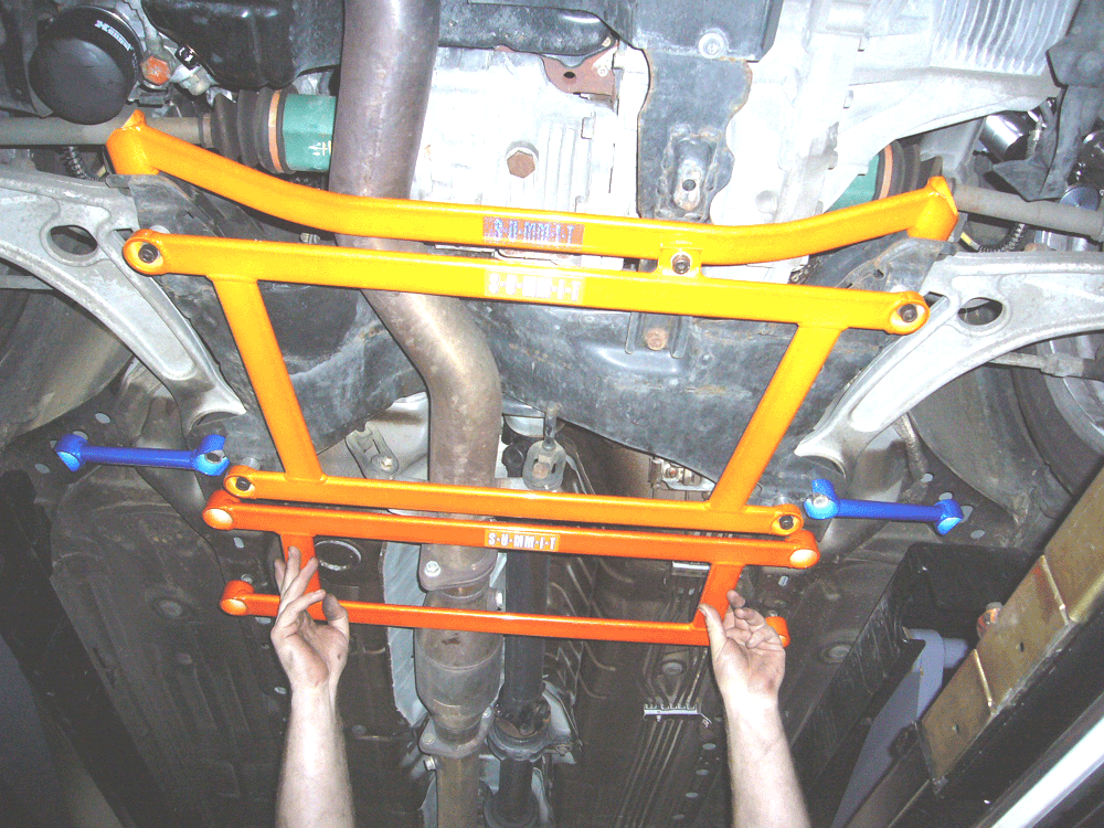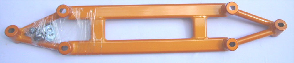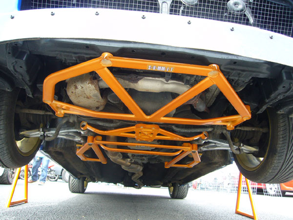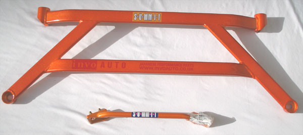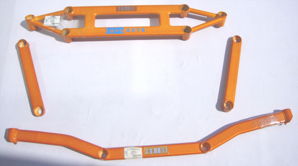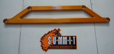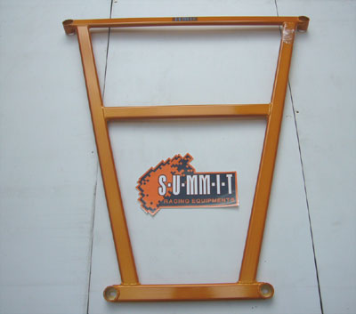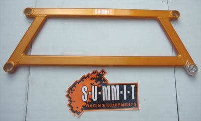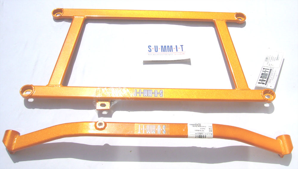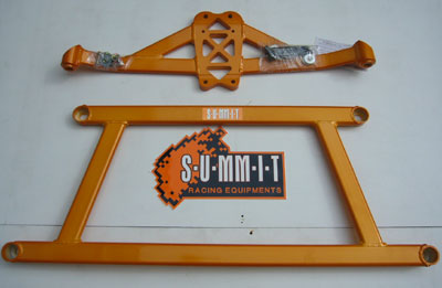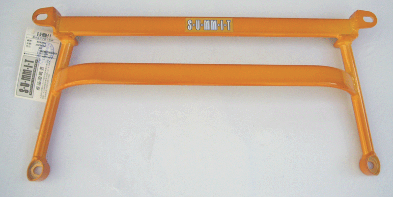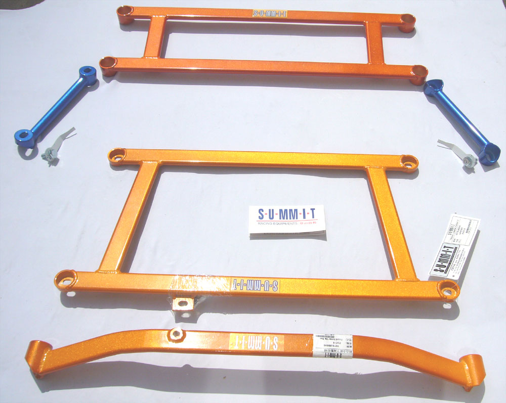 S-U-MM-I-T Body Chassis Brace Bar Product Front Lower Four Point Middle Body Chassis Aluminium Brace. UK Mitsubishi Lancer Model 7, 8 and 9 ( 02 to 07 and Japan Grey Import Mitsubishi Lancer 7 8 02 to 07 Model CS3A and CS9W The SUMMIT reinforce equipments improve chassis rigidity and reduce the flex. By using a monocogue aluminium triple tube shaft and forged parts. Which are not only lightweight but are also exceptionally strong. SUMMIT more upgrades the chassis performance and there by improves handling. This strut brace is 50% stronger than other type of brace because the SUMMIT Brace is not hollow, it has 3 to 4 layers of tubing inside the brace. |