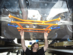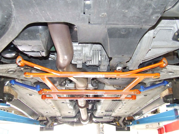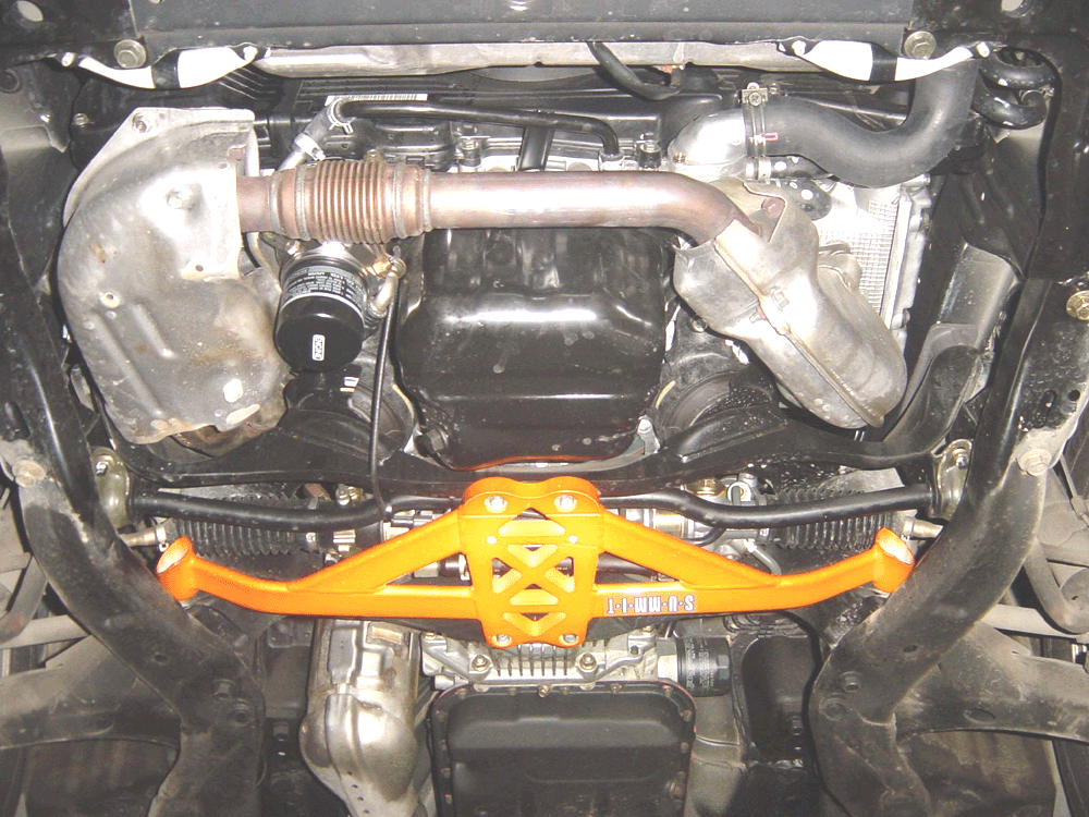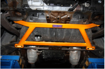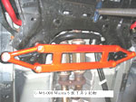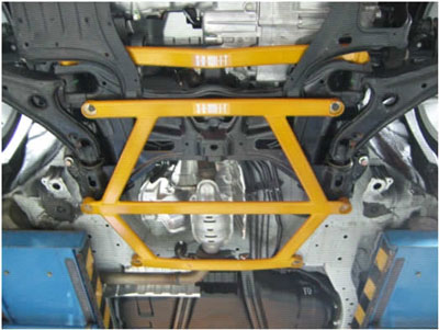 S-U-MM-I-T Body Chassis Brace Bar Product Front Lower Rear Aluminium Four Point Body and Sub-frame Strut Brace. NISSAN INFINITIS FX35 The SUMMIT reinforce equipments improve chassis rigidity and reduce the flex. By using a monocogue aluminium triple tube shaft and forged parts. Which are not only lightweight but are also exceptionally strong. SUMMIT more upgrades the chassis performance and there by improves handling. This strut brace is 50% stronger than other type of brace because the SUMMIT Brace is not hollow, it has 3 to 4 layers of tubing inside the brace. |